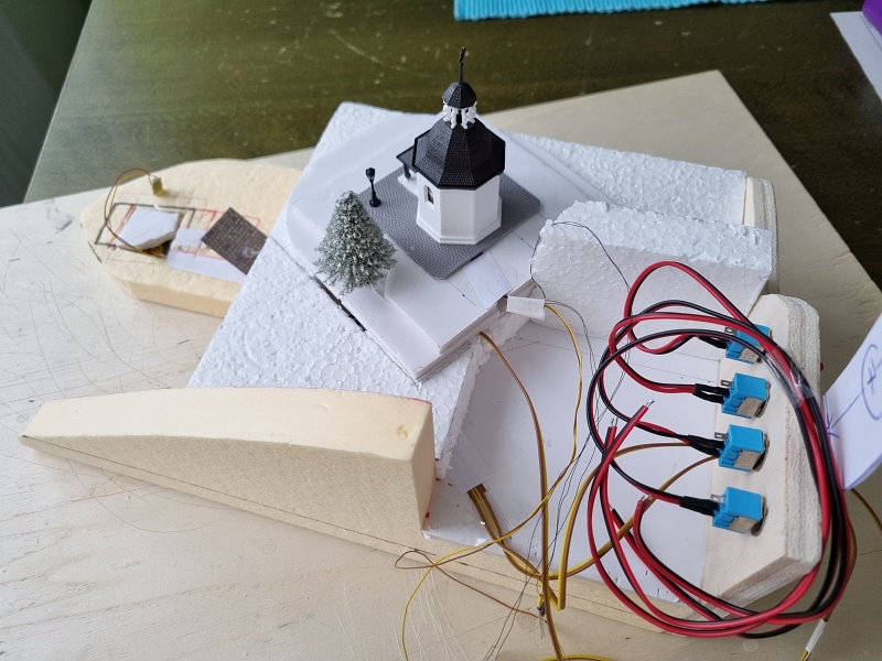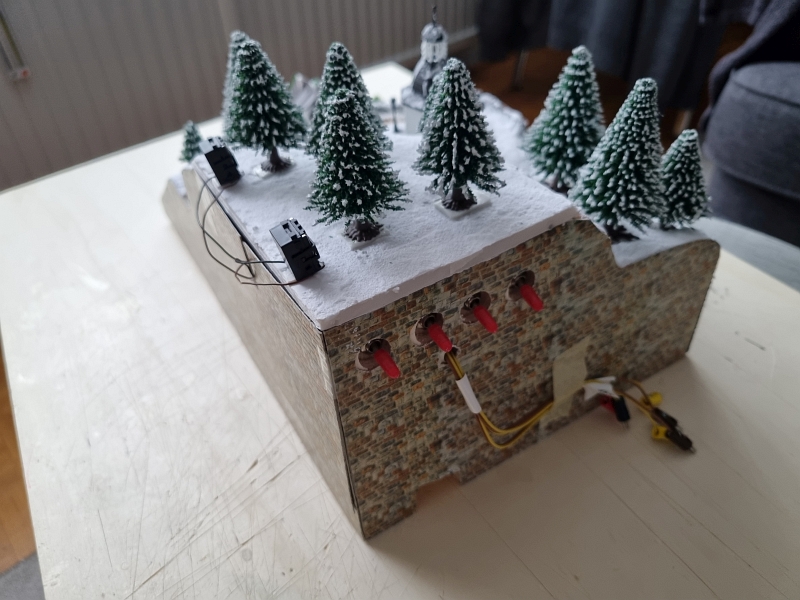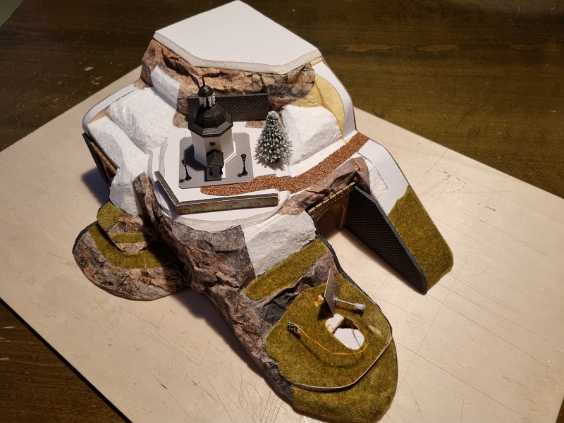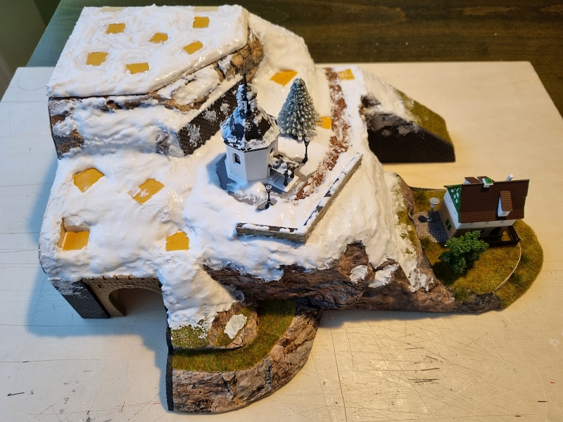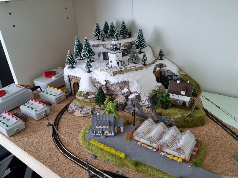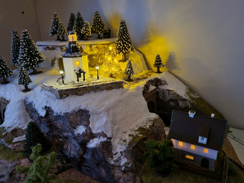 Wie, anfangs Dezember, in Wien der erste Schnee gefallen ist, ist mir so durch den Kopf gegangen, dass sich eigentlich auf keiner meiner „MOBA-Anlagen“ ein Motiv mit Schnee befindet. Da ich keinen Platz für eine weitere „MOBA-Anlage“ habe, habe ich mir überlegt was ich tun könnte. Da ist mir folgende Idee gekommen ….. Der Berg, mit Tunnel, auf meiner „REGionAL-Bahn Z“ ist mit wenigen Handgriffen abnehmbar. Ich werde einfach einen zweiten Berg bauen. Die beiden Berge sind sodann austauschbar. Jetzt habe ich einen „Sommerberg“ und einen „Winterberg“. Je nach Jahreszeit wird der Berg getauscht. Rechtzeitig zum „Heiligen Abend“ ist der „Winterberg“ fertiggeworden. Die Lichter sind erstmals erstrahlt und die „Weihnachtsglocken“ ertönt.