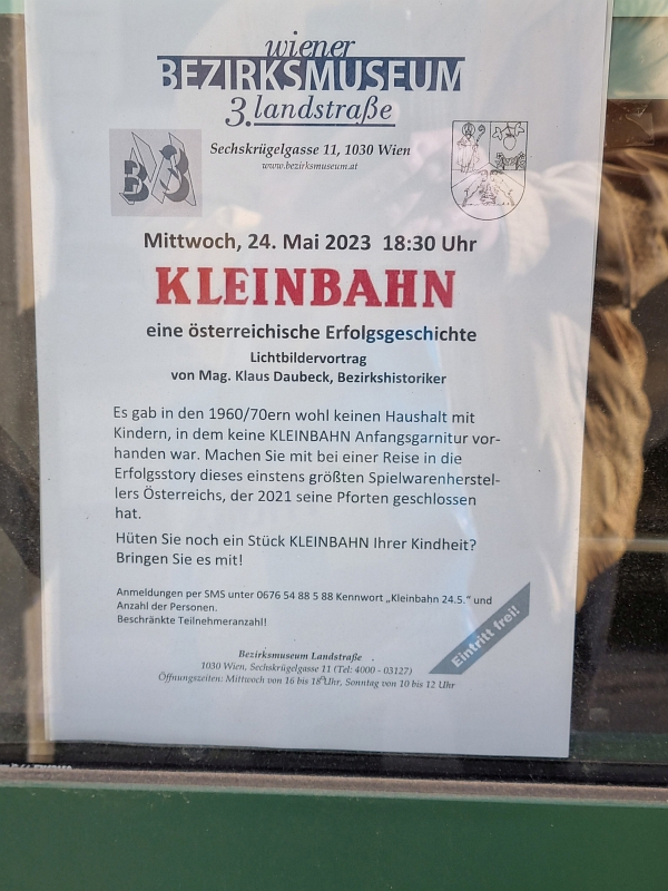 Am Mittwoch, den 24. Mai 2023 habe ich im Bezirksmuseum, im 3. Wiener Gemeindebezirk, einen Lichtbildervortrag besucht. Thema: ‚KLEINBAHN, eine österreichische Erfolgsgeschichte‘ Der Vortragende, Herr Mag. Klaus Daubeck, Bezirkshistoriker, seit Kindheit mit der KLEINBAHN befasst, mit viel ‚Insiderwissen‘, war sehr kompetent. Ebenfalls anwesend und gerne für Auskünfte bereit, war Frau Kommerzialrätin Angelika Pfneisl, KLEIN-Tochter, welche ab 2007 die Firma weitergeführt hat.