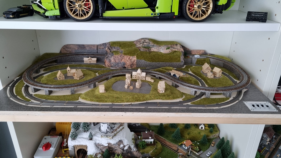 Gestern habe ich meine MOBA-Anlage ‚Teeny-Weeny Train‘ fertiggestellt. Dabei handelt es sich um eine Produkt von ‚KK Eishindo‘, vertrieben durch ‚TGauge.com‘, bzw. Firma ‚Lemisso‘ in Deutschland. Der Buchstabe T steht für THREE – soll heißen die Spurweite beträgt 3mm (eigentlich 2,9mm) – Maßstab 1:450. Heute habe ich meine Züge probeweise fahren lassen. Und anschließend ab damit an den endgültigen Standort, nämlich ins Regal.
