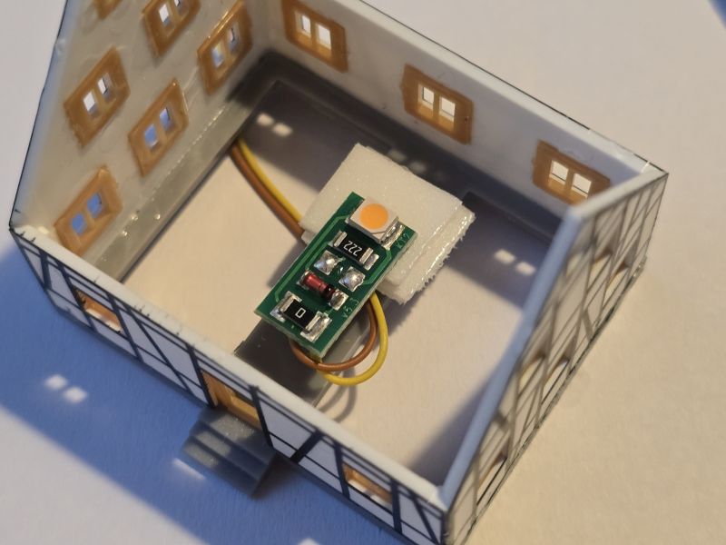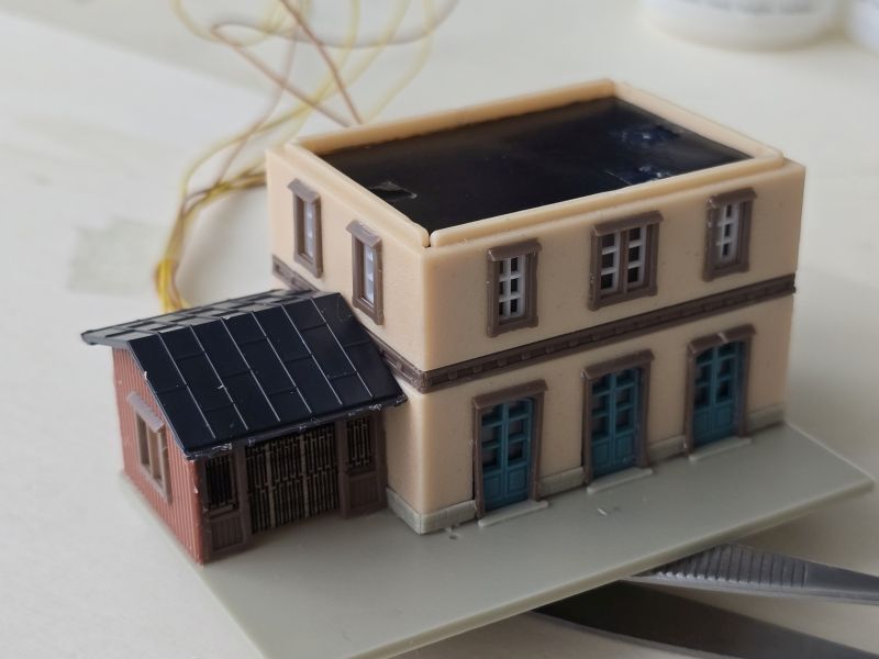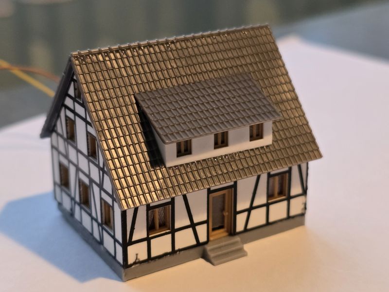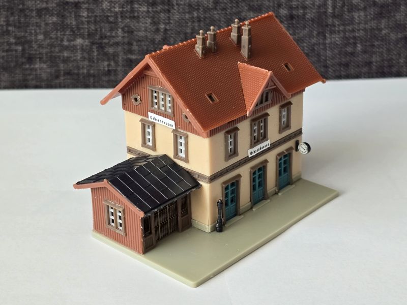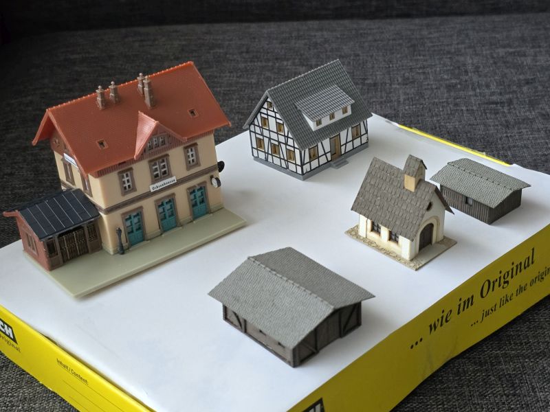 Ende Jänner habe ich mit dem Bau der Gebäude für meinen ‚Grünen Koffer – Gläserner Zug‘ begonnen. Dabei hat es sich um das ‚Kleingebäudeset‘ (Fa. NOCH), sowie um das ‚Fachwerkhaus‘ und den ‚Bahnhof Ochsenhausen‘ (Fa. FALLER) gehandelt. Den ‚Bahnhof Ochsenhausen‘ habe ich ohne ‚Güterhalle‘ gebaut, da er ansonst zu groß gewesen wäre. Anfang Februar waren alle Gebäude, natürlich mit Beleuchtung, fertiggestellt.