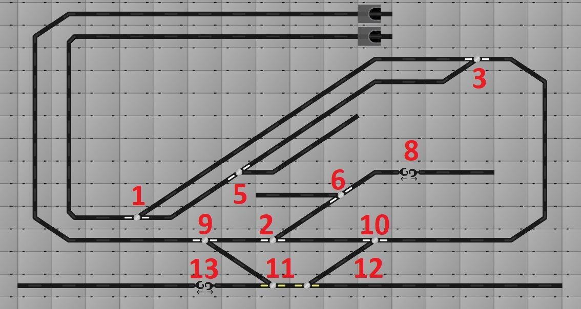 Dadurch ergibt sich für meine MOBA dieses Stellwerk für 9 Weichen und 2 Entkupplungsschienen auf der 'Oberen Ebene' (auf der 'Unteren Ebene' befinden sich nur Gleise)