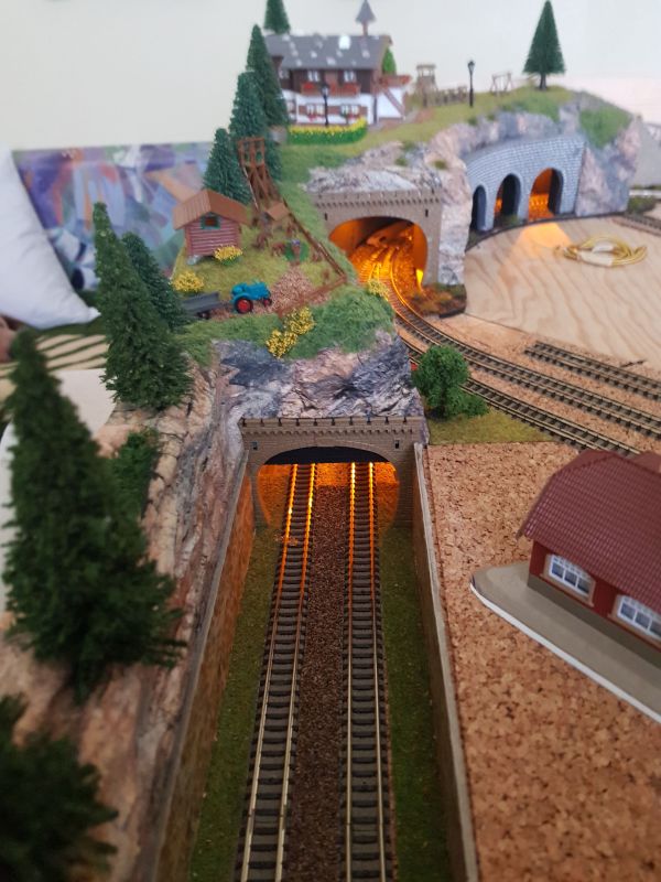 Ich habe auf der ‚unteren Ebene‘ 4 FALLER LED-Beleuchtungssockel installiert. Außerdem habe ich die Tunneleinfahrt in die ‚untere Ebene‘, innen, gelb beleuchtet.