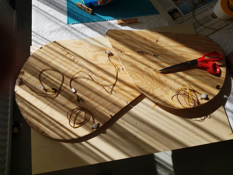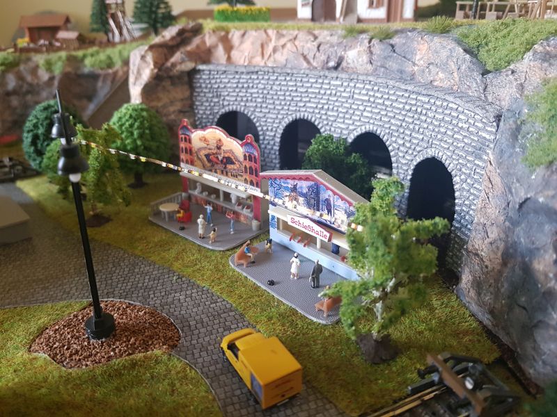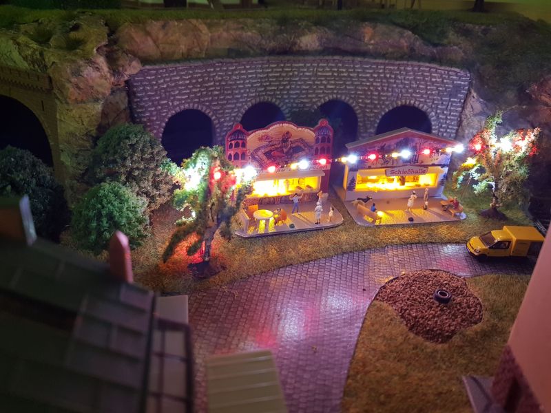 Zweitens habe ich zwei ‚Kirmesbuden‘ aufgestellt. Diese haben als Innenbeleuchtung eine gelbe LED erhalten. Von Baum zu Baum habe ich eine ‚LED-Lichterkette‘ (von FALLER) gespannt. Dafür habe ich einen separaten Kippschalter zum Ein- und Ausschalten, unabhängig von jedweder anderen Beleuchtung, installiert.