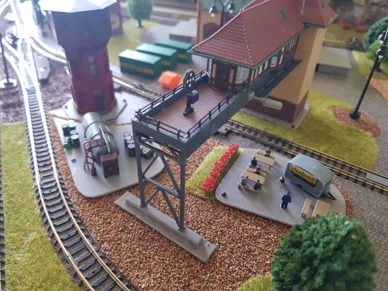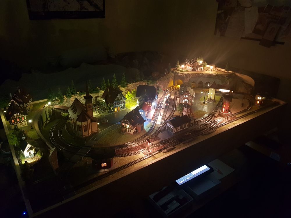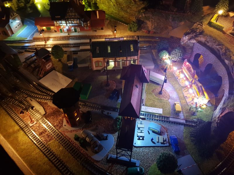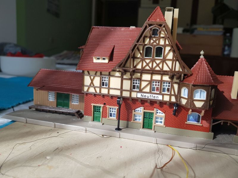 Am Bahnhof habe ich eine Änderung vorgenommen. Die beleuchtete Bahnhofsuhr war zu nahe an der Wandleuchte platziert. Dadurch ist sie nicht wirklich zur Geltung gekommen. Daher habe ich die Wandleuchte in einer größeren Entfernung zur Bahnhofsuhr angebracht.