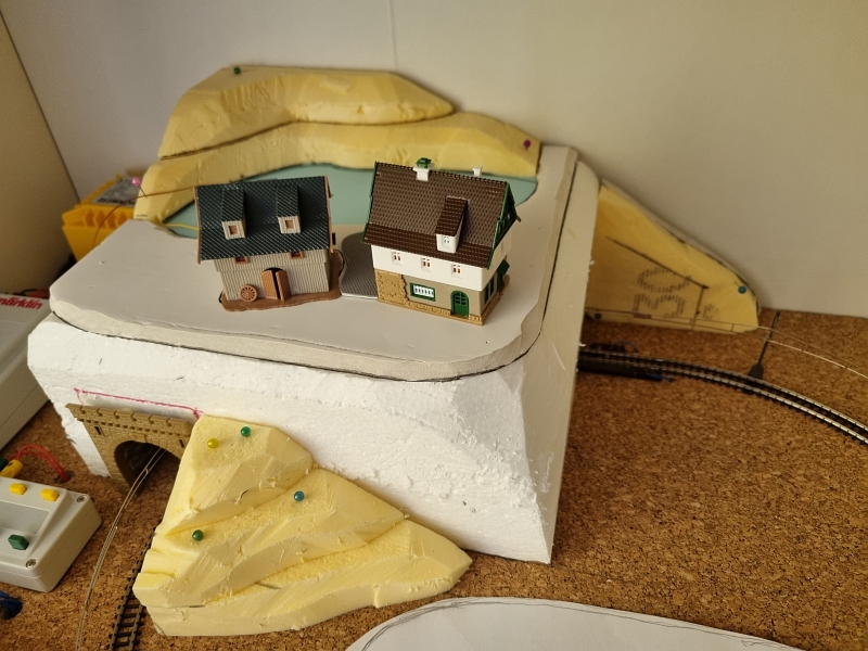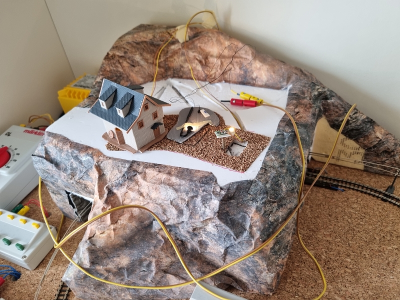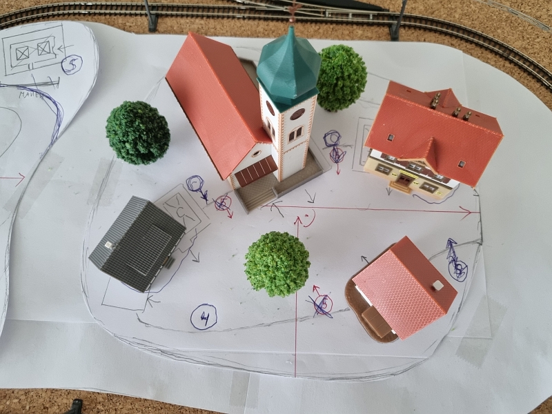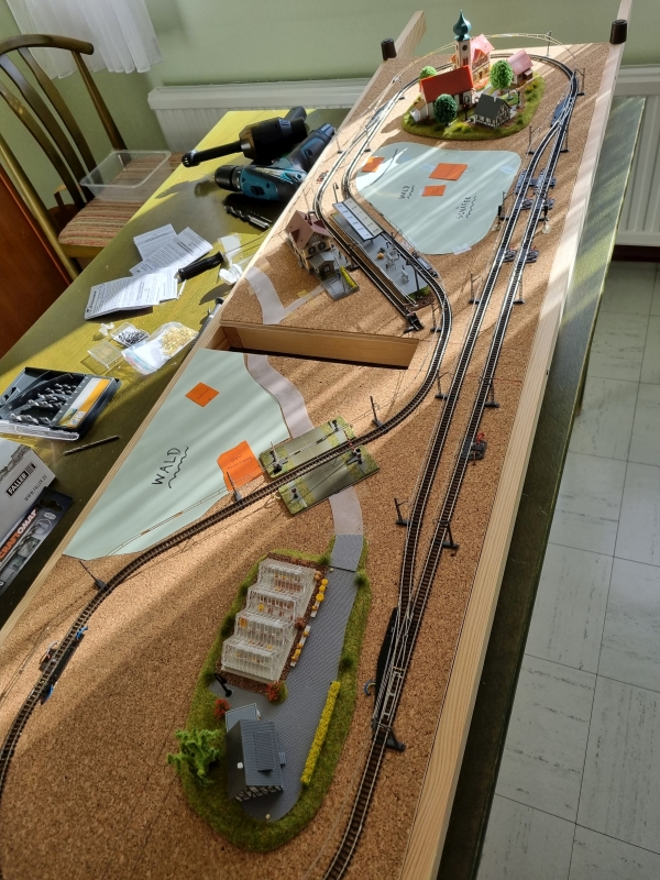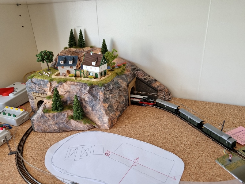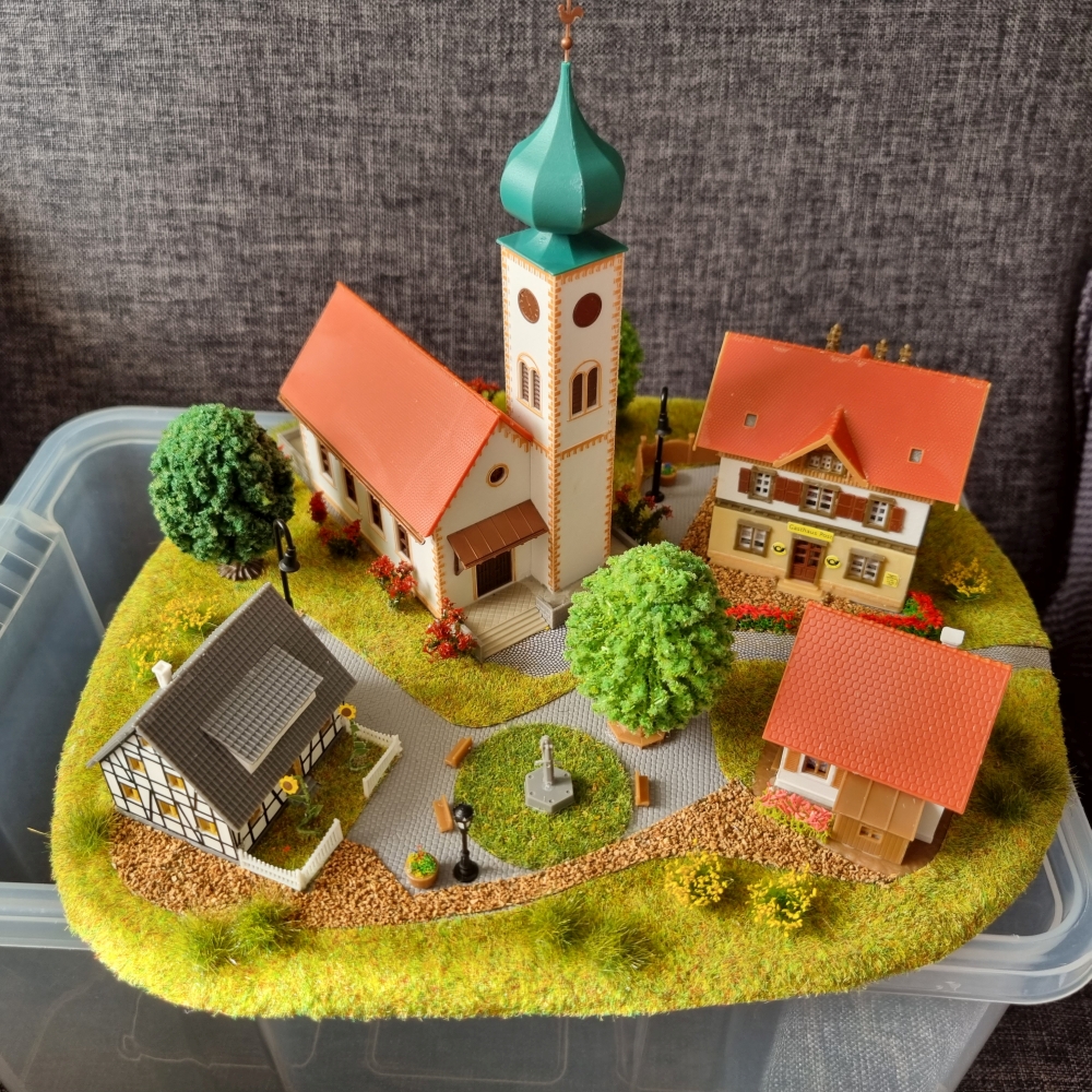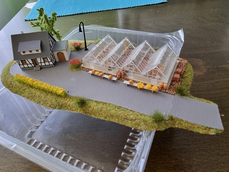 Nachdem die ‚Grundplatte‘ fertiggestellt war, habe ich mit dem Bau der einzelnen ‚Module‘ begonnen. Noch aus der Verpackung des ‚Startersets‘ ist ein Berg mit Tunnel, der sogenannte ‚Sommerberg‘, entstanden.Es folgte sodann der Bau der ‚Gärtnerei‚, des ‚Bahnhof’s und des ‚Dorf’s. Bilder davon nachfolgend: