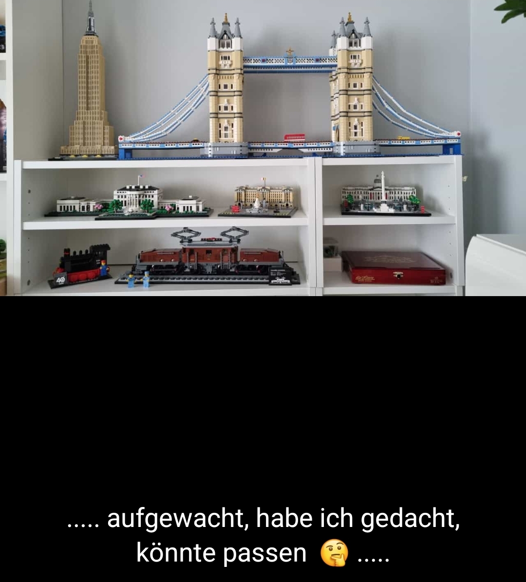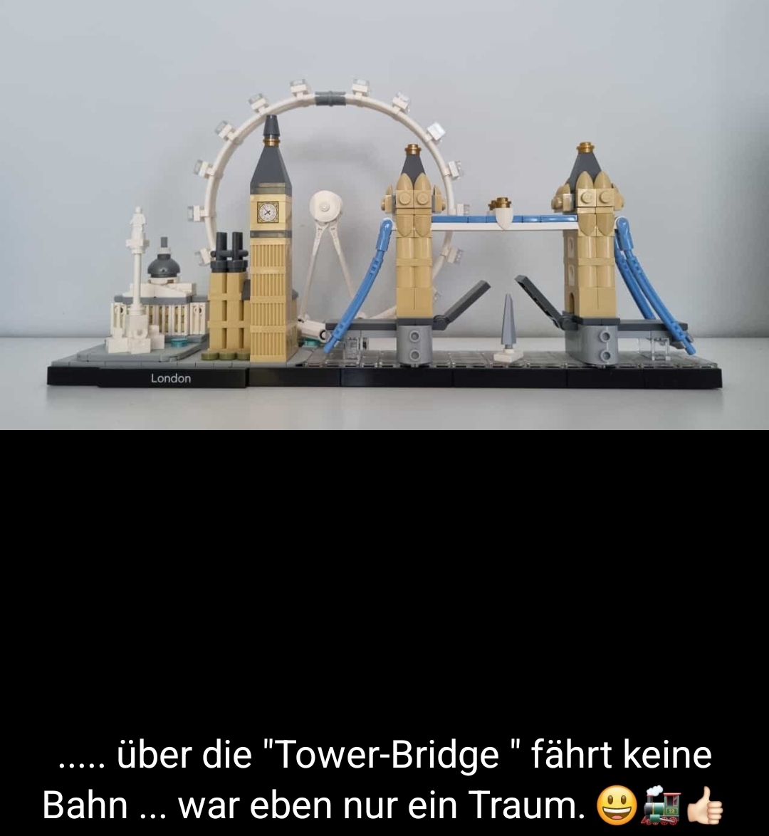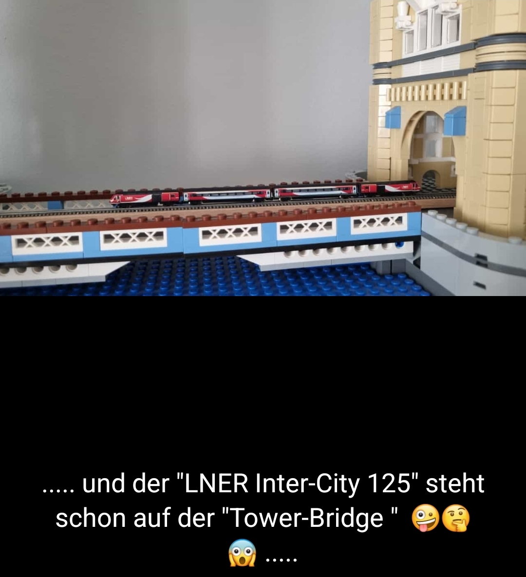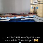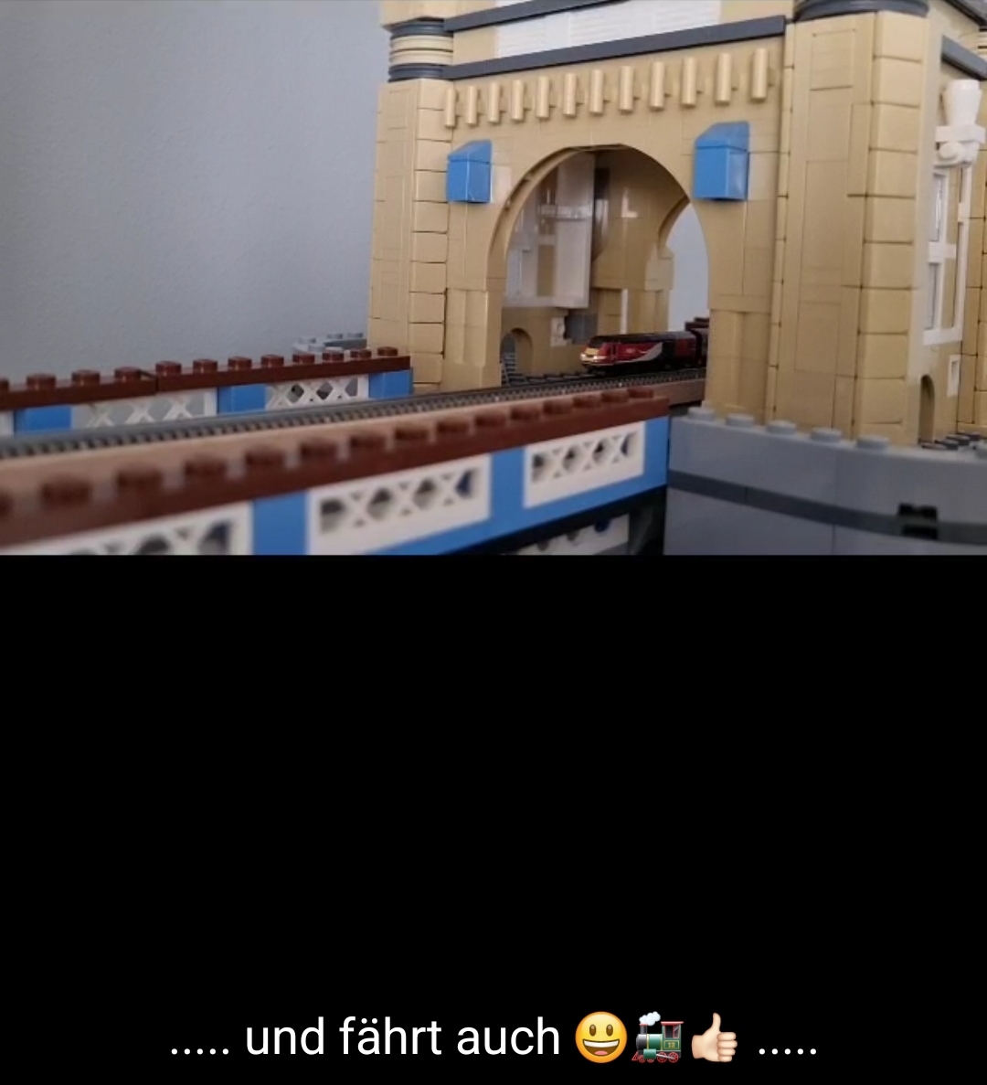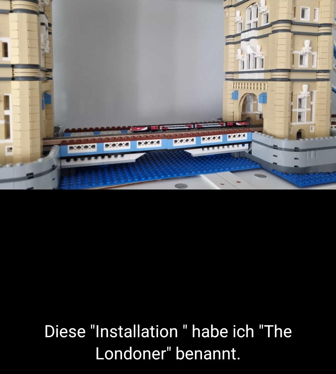 Aus den restlichen Gleisen mit ‚Bettung‘ habe ich die ‚resTl-bahn‘ gebaut. Aber ich habe ja auch noch zwei ‚Flexgleise‘ – ‚Fine Scale‘, sowie 2 Sensoren. Da ist mir eine Idee gekommen und ich habe ein Eisenbahngleis auf meiner ‚Tower Bridge‘ (LEGO – Creator Expert – Art. 10214) verlegt. Dieses Modell besteht aus 4.295 Steinen und hat eine Länge von 102cm und eine Höhe von 45cm. Passt …. In diesem Fall spreche ich besser von einer ‚Installation‘ und nicht von einer ‚MOBA-Anlage‘.